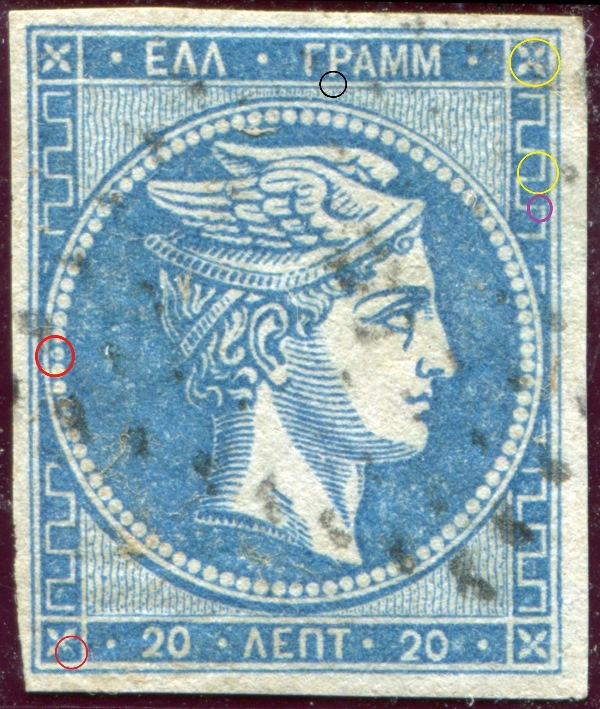 Weiterhin zeigt die Marke den Plattenfehler "Weiße Linie hinter dem Nacken" (allerdings sehe ich kleine Differenzen bei dessen Position im Vergleich zur Abbildung im Karamitsos).