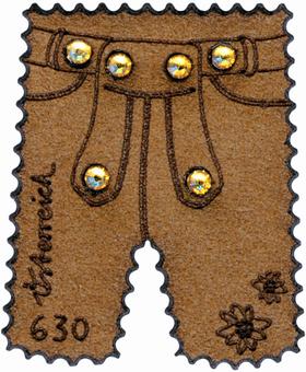 Der neueste Gag der Österreichischen Post ist die im September verausgabte Lederhosen-Briefmarke für stolze 6,30 EUR. Vom Künstler Swarovski gestaltete Kristalle zieren eine aus Alcantara-Leder gestanzte Sondermarke in Form einer alpenländischen Lederhose.