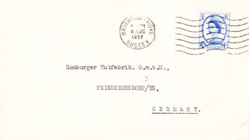 Dieser Beleg wurde am 08.08.1957 in Brighton aufgegeben und durchlief zur Ausgangssortierung die dortige TRANSORMA, was ein Operatorstempel "X" dokumentiert.