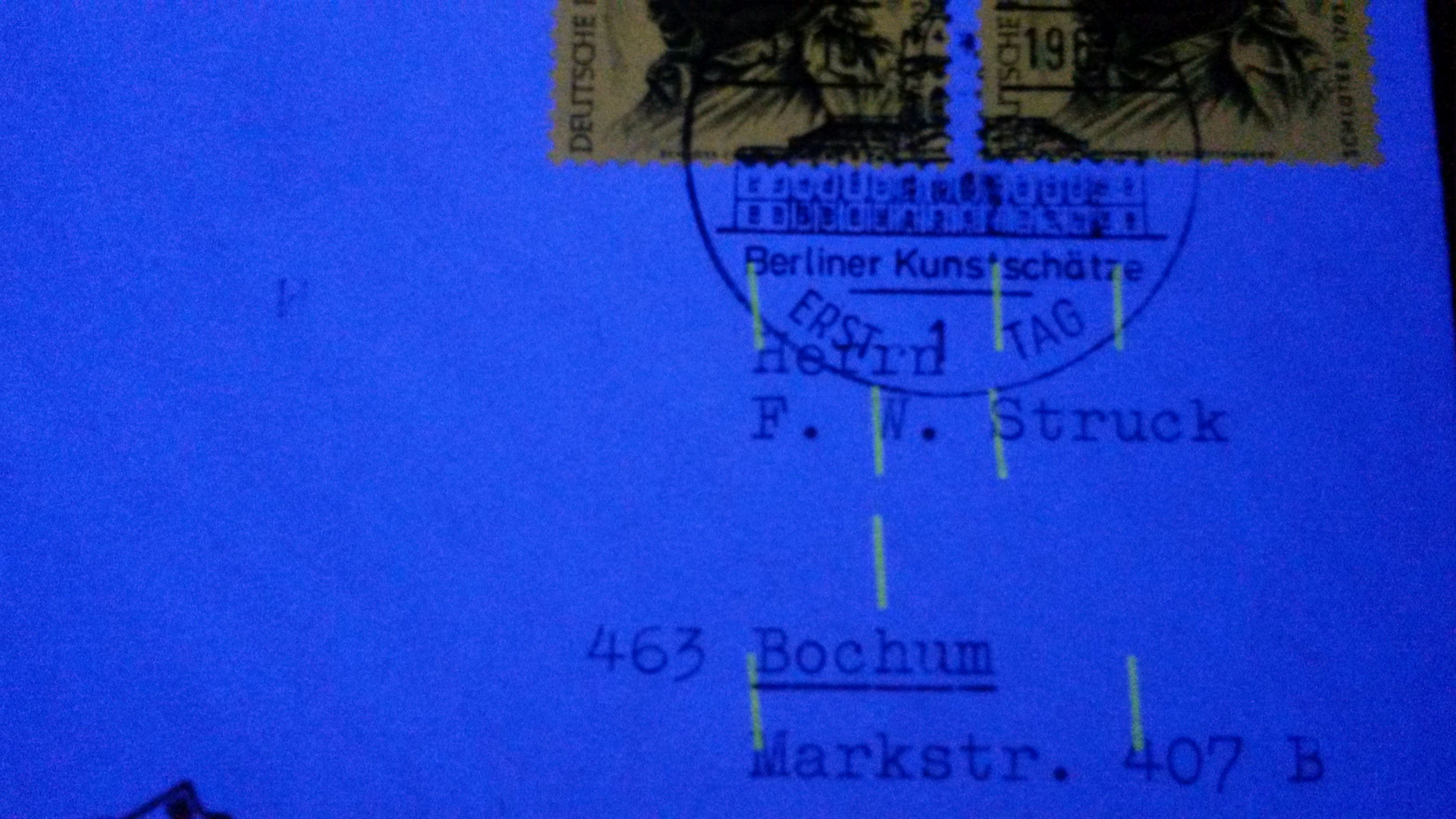 Dieser nach Bochum adressierte FDC aus Berlin durchlief in Bochum zur Eingangscodierung die automatische Briefsortieranlage, wo am Codierplatz "H" eine Linearcodierung "4314" für die "Markstraße" angebracht wurde.