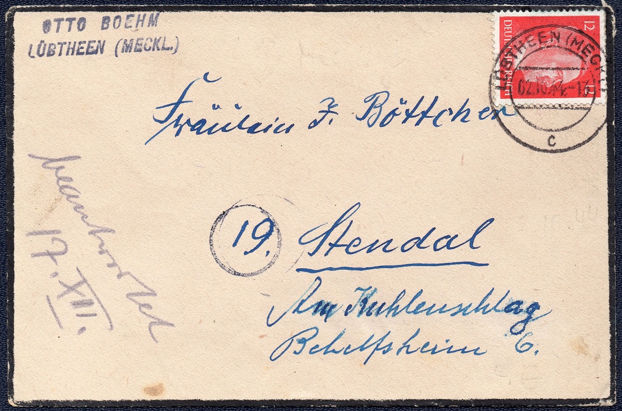 Inlandsbrief im Fernverkehr bis 20 g vom 2. Oktober 1944 aus Lübtheen in Mecklenburg nach Stendal. Der Brief wurde portorichtig in Einzelfrankatur mit 12 Reichspfennigen (1 x Mi.-Nr. 827) frankiert und mit dem Zweikreisstegstempel LÜBTHEEN (MECKL) / c abgeschlagen.