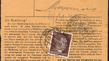 ab 13.08.1944 wurden auf Grund der Kriegseinflüsse fünf Entfernungszonen auf nur noch zwei Entfernungszonen (Nahzone bis 75 km, Fernzone über 75 km) reduziert. Das Paket zu 8 kg und bei einer Entfernung von über 75 km kostete 1,20 RM. Die Versicherungsgebühr bei einem Wert bis zu 500 RM betrug weitere 10 Pfennig. Zusammen also die 1,30 RM.