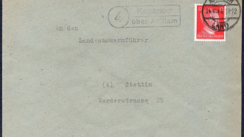 Weiter geht es mit einem Inlandsbrief im Fernverkehr bis 20 g aus Kosenow in der preußischem Provinz Pommern vom 24. Oktober 1944 nach Stettin in der preußischen Provinz Pommern. Der Brief wurde portorichtig in Einzelfrankatur mit 12 Reichspfennigen (1 x Mi.-Nr. 827 - Ausgabe vom Dezember 1942) frankiert. In Kosenow (Poststelle II) wurde neben dem Postwertzeichen der Halbspatelkreissehnenstempel (4) Kosenow / über Anklam abgeschlagen. Beim Leitpostamt Anklam erfolgte der Abschlag des Postwertzeichens mit dem Kreisstegstempel mit Bogen oben und unten ANKLAM / LAND.