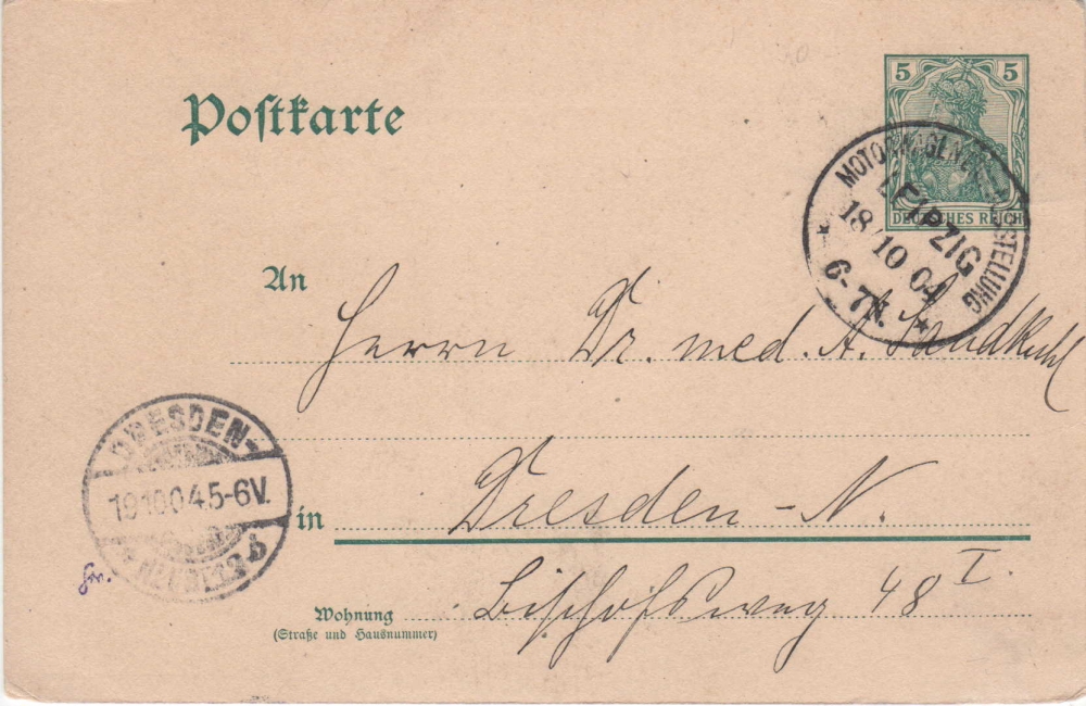 die von mir gezeigten Belege haben nicht direkt was mit Autowerbung zu tun. Es sind zwei Postkarten von der in Leipzig stattfindenden Motorwagen-Ausstellung. Erstmalig fand sie vom 19.10. bis 23.10.1900 statt. Bereits zu diesem Anlass gab es einen Sonderstempel. Eine ähnliche Version des Stempels gab es 1901 und eine weitere wurde bei den Motorwagenausstellungen von 1902 bis 1909 und im Jahr 1913 verwendet. Die beiden Belege stammen aus den Jahren 1904 und 1905. Die Sonderstempel sind wegen der kurzen Dauer der Ausstellungen von 5 bis zu 14 Tagen nicht allzu häufig zu finden.