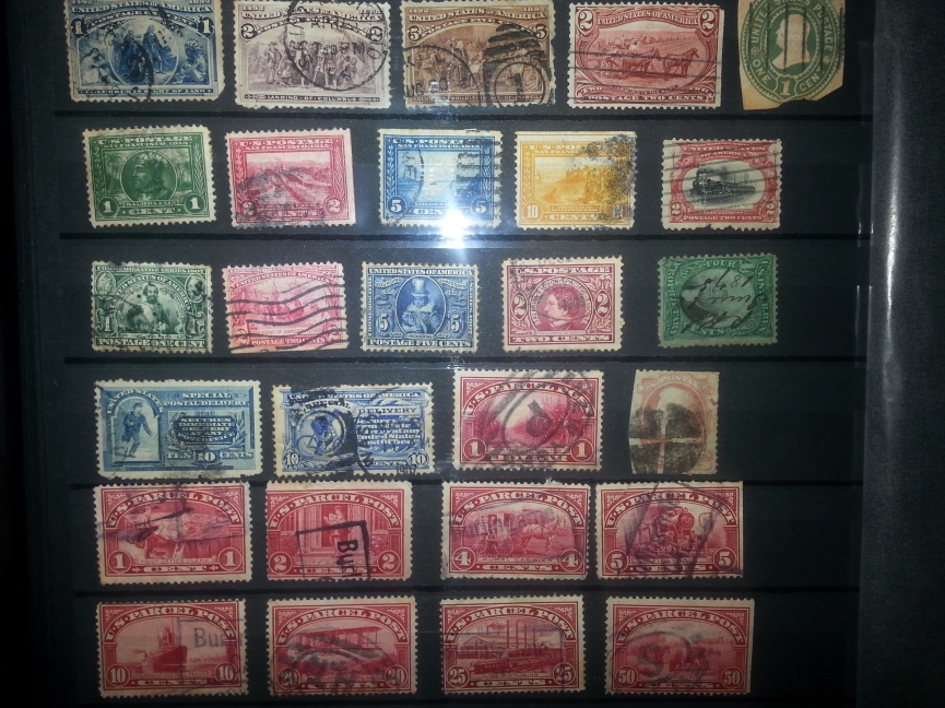 Die Paketmarke auf dem letzten Blatt unten rechts zu 50 Cents (U.S. Parcel-Post), Michel-Nr. Paketmarke 10, könnte noch etwas seltener sein, in meinem Uralt-Katalog war sie mal mit 70,- DM notiert. Allerdings ist das Bild nicht gut zentriert. Ob die rechts geschnittene Marke vom rechten (ungezähnten) Rand stammt oder von jemand nachträglich mit der Schere abgeschnitten wurde, kann ich auch nicht sagen, ebenso nicht den aktuellen Preis.