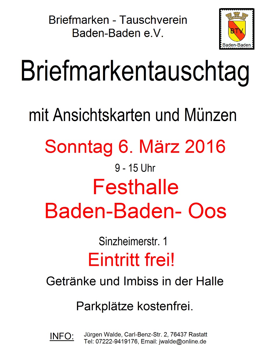 29. Februar 2016 um 15:13 #1 Liebe Freunde,der Baden-Badener Briefmarkentauschverein lädt am 06.03.2016 zum Großtauschtag in die Baden-Ooser Festhalle.Es sind alle die Zeit und Lust haben herzlich eingeladen...