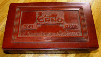 ein kleines Plastik-Kästchen mit Beschriftung "Erno Edelklasse" - darin ein Leuchtturm-Zähnungsschlüssel sowie jede Menge unbenutzte Klebefalze. Das Kistchen hat die Maße 11x6,5x3 cm. Wegen der "Dicke" ist ein Versand nur als Maxibrief möglich (2,60 Porto).
