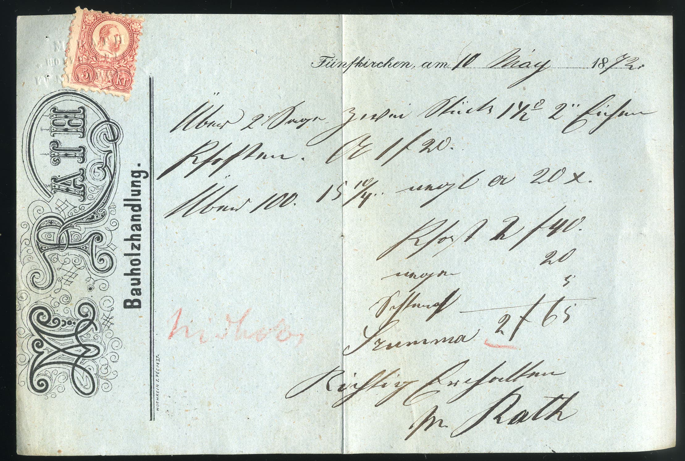 Es handelt sich wohl um eine Quittung über die Bezahlung einer Bauholzrechnung. Ich lese da "Eisenpfosten" im Schreiben. Über die Bauholzhandlung M. Rath in Fünfkirchen (heute Pécs in Ungarn, früher (1872) mal zur Österreichisch-Ungarischen Monarchie gehörend, findet man nichts mehr im Netz. Die Wörter sind sehr schwer zu entziffern, unten steht: Richtig erhalten, M. Rath. Bei den Zahlenangaben müßte man schauen, welche Maßeinheiten für Holz und welche Währungsbezeichnungen damals in Österreich-Ungarn verwendet wurden.