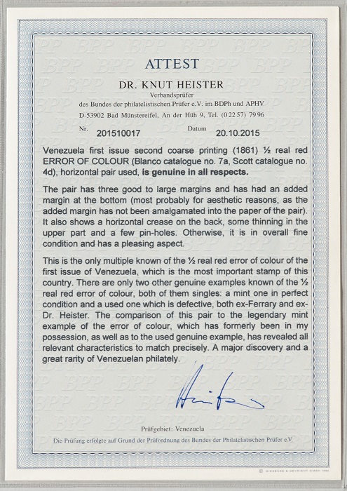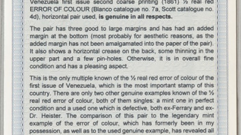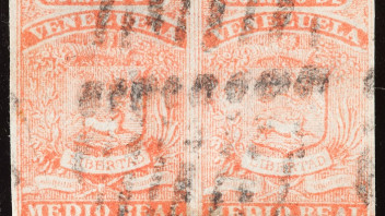 Beim Internet-Auktionshaus Lauritz in Hamburg kann bis heute abend 18.00 Uhr ein Paar einer sehr seltenen Marke aus Venezuela ersteigert werden. Nur 4 Exemplare der "Roten Venezuela" sind weltweit bekannt, dieses Paar wurde erst im vergangenen Jahr in einer Privatsammlung entdeckt.