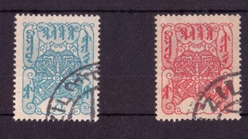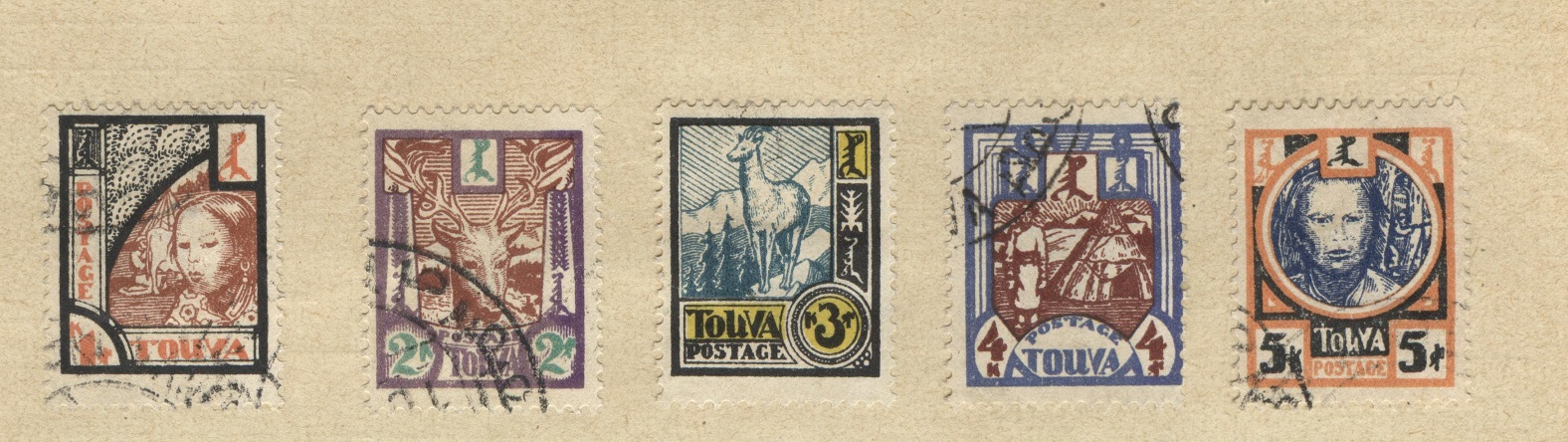 Das ist mal wieder die Volksrepublik Tannu-Tuwa in der Nord-Mongolei, die wir erst vor kurzem hatten. Wohl die Michel-Nummern 1 und 2 von 1926, Abbildung: Rad der Ewigkeit (=Dharmachakra), die ersten beiden Werte aus einem zehn-teiligen Satz (es gibt auch 4 Überdruckwerte davon):