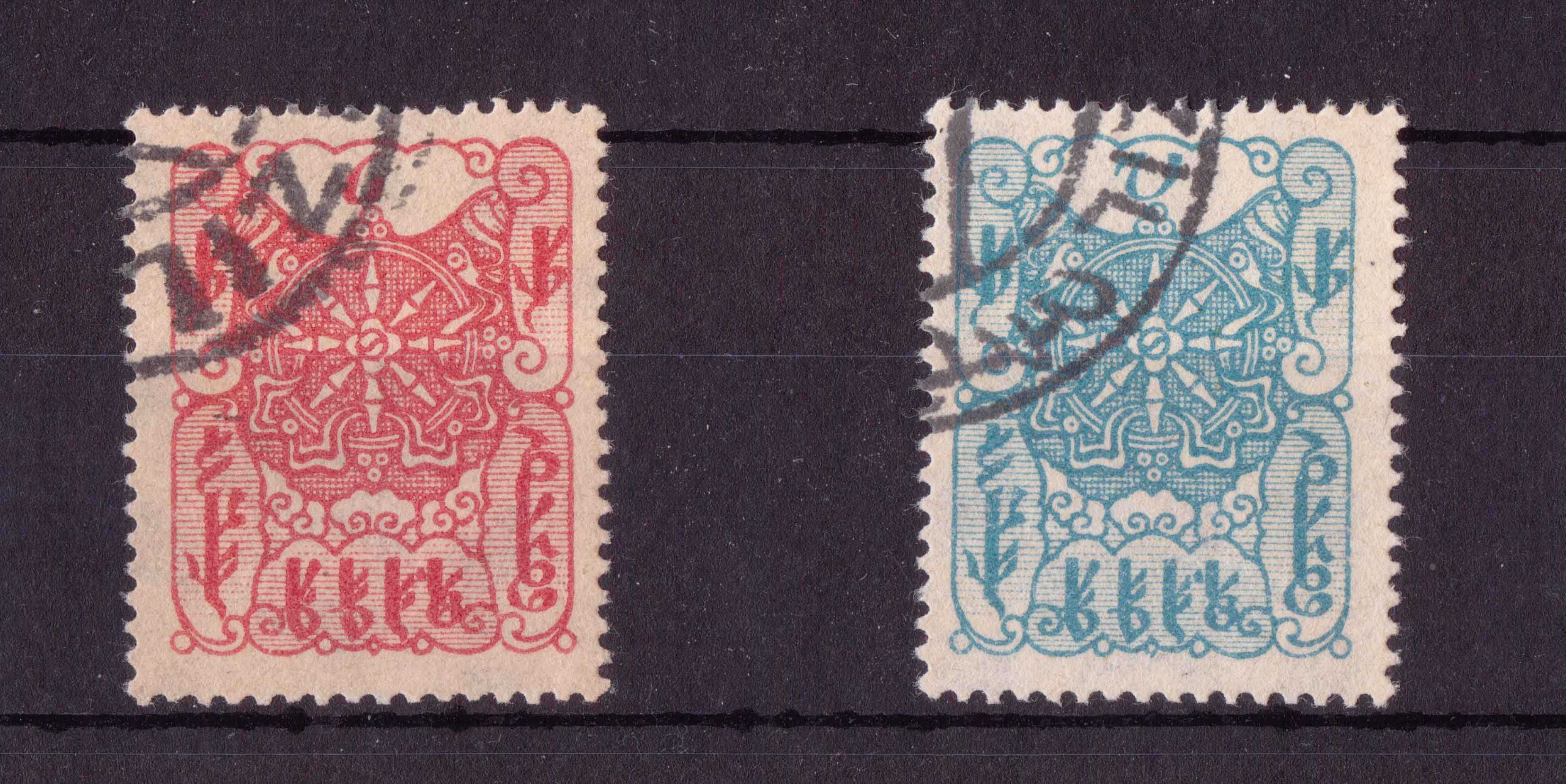 Das ist mal wieder die Volksrepublik Tannu-Tuwa in der Nord-Mongolei, die wir erst vor kurzem hatten. Wohl die Michel-Nummern 1 und 2 von 1926, Abbildung: Rad der Ewigkeit (=Dharmachakra), die ersten beiden Werte aus einem zehn-teiligen Satz (es gibt auch 4 Überdruckwerte davon):