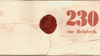 Oben links finden wir den Aufkleber mit der Sendungsnummer 230. Diese Aufkleber der Fahrpost bestanden aus zwei Teilen, der kleinere Teil kam auf den Begleitbrief, der größere auf das Paket. Hier gab es kein zugehöriges Paket, der größere Abschnitt " 230 / aus Reinbek" wurde auf die Rückseite geklebt. So etwas habe ich bislang auch nicht gesehen.
