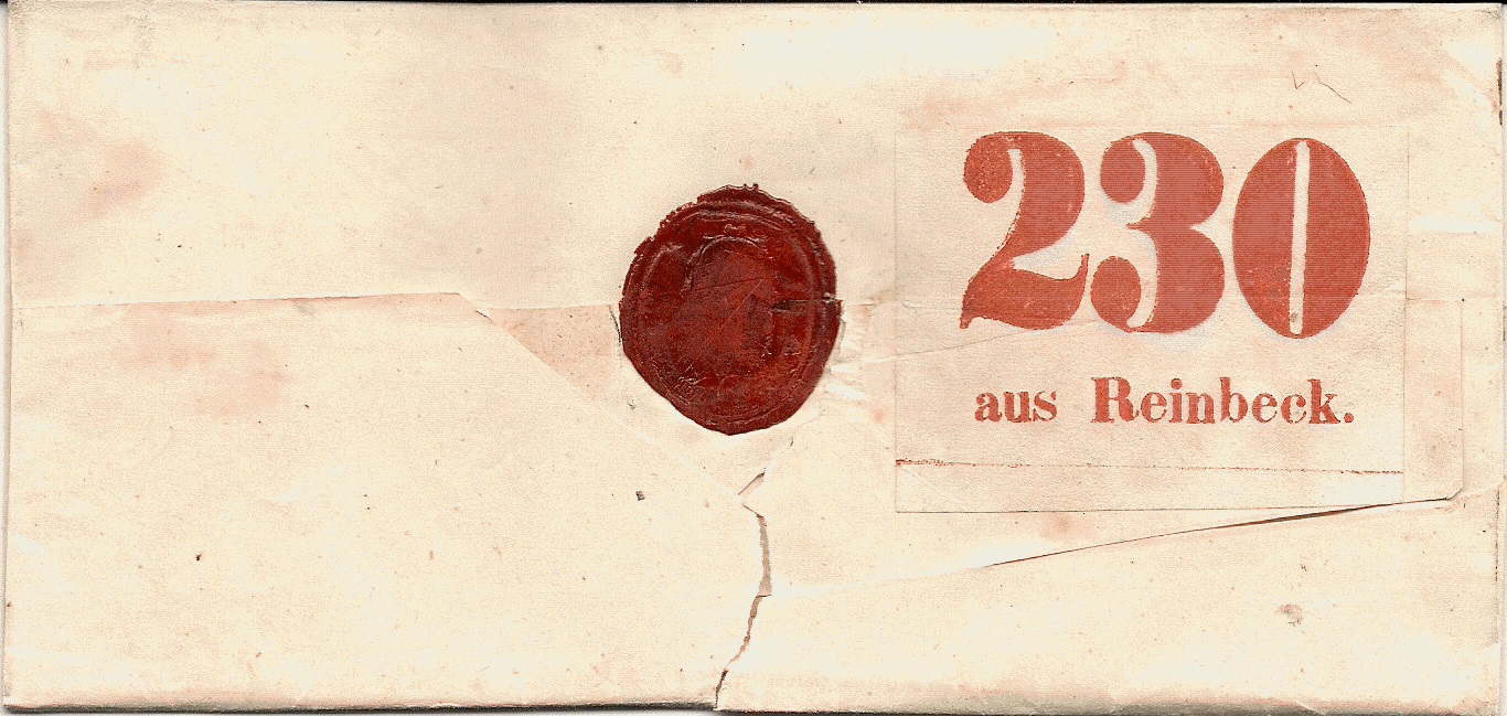 Oben links finden wir den Aufkleber mit der Sendungsnummer 230. Diese Aufkleber der Fahrpost bestanden aus zwei Teilen, der kleinere Teil kam auf den Begleitbrief, der größere auf das Paket. Hier gab es kein zugehöriges Paket, der größere Abschnitt " 230 / aus Reinbek" wurde auf die Rückseite geklebt. So etwas habe ich bislang auch nicht gesehen.