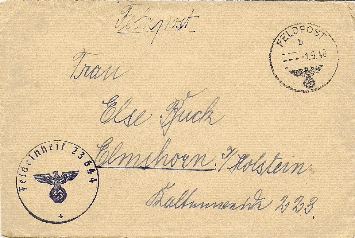 Schließlich ein Feldpostbrief aus dem 2. Weltkrieg. Abgestempelt am 1.9.40 mit dem Kreisstempel Feldpost b von der "Feldeinheit 23644" nach Elmshorn.