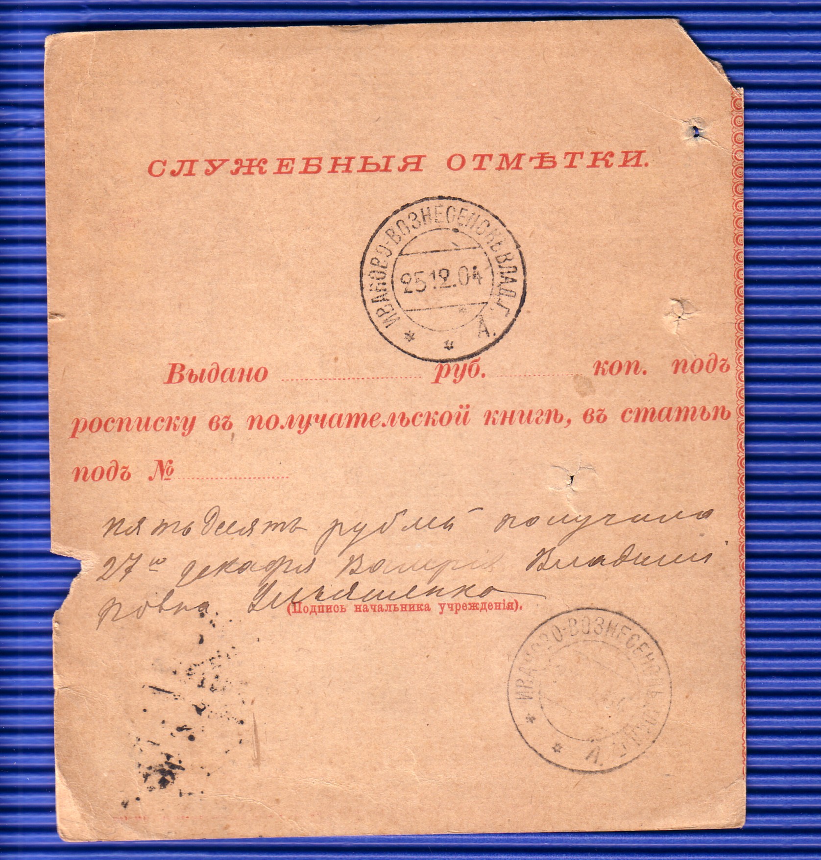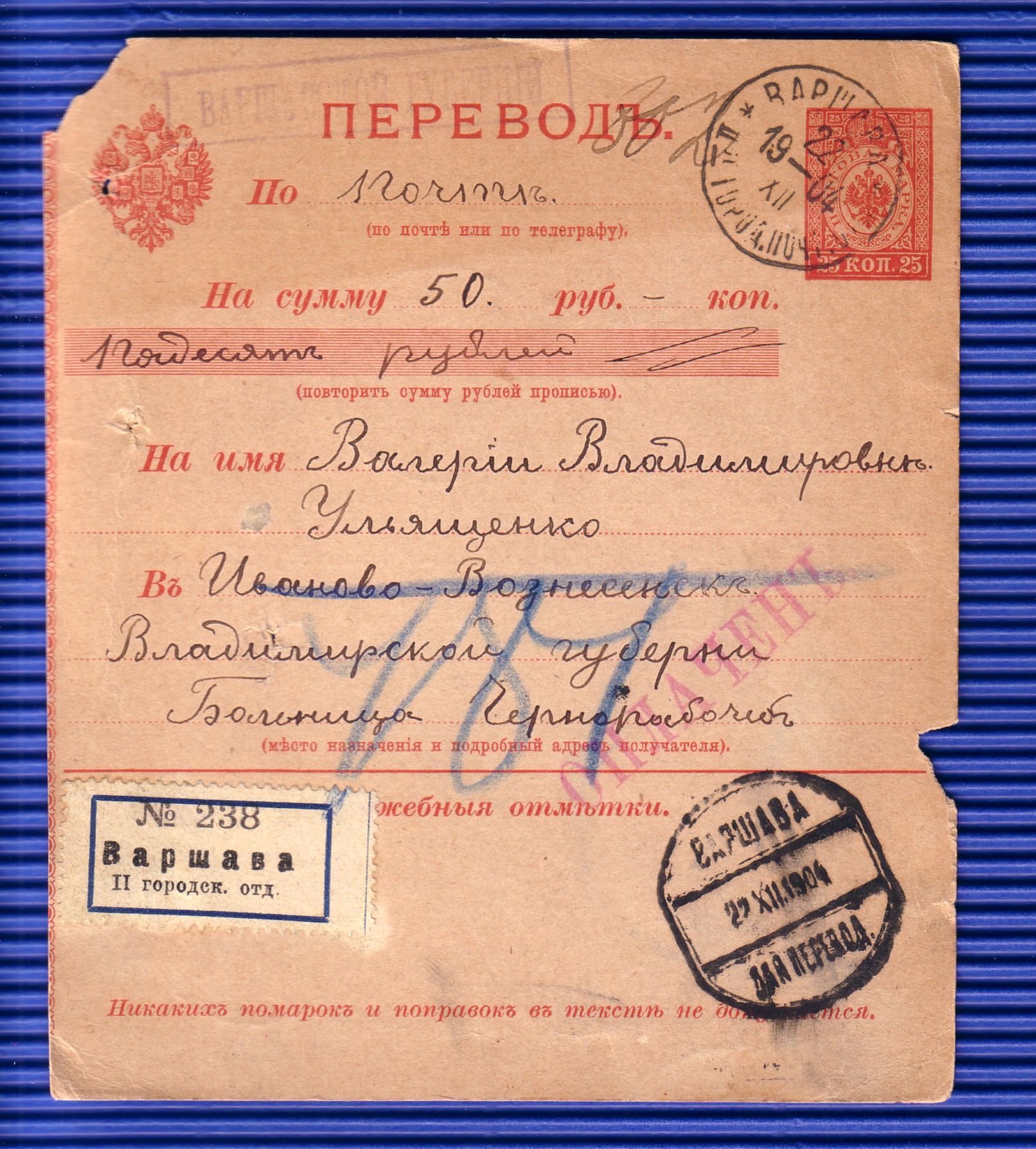 Das ist eine Postanweisung Russland 1901. Im Michel Ganzsachen- Osteuropa unter Russland/ A5 ( 1994/95 mit 180.- DM bewertet )
