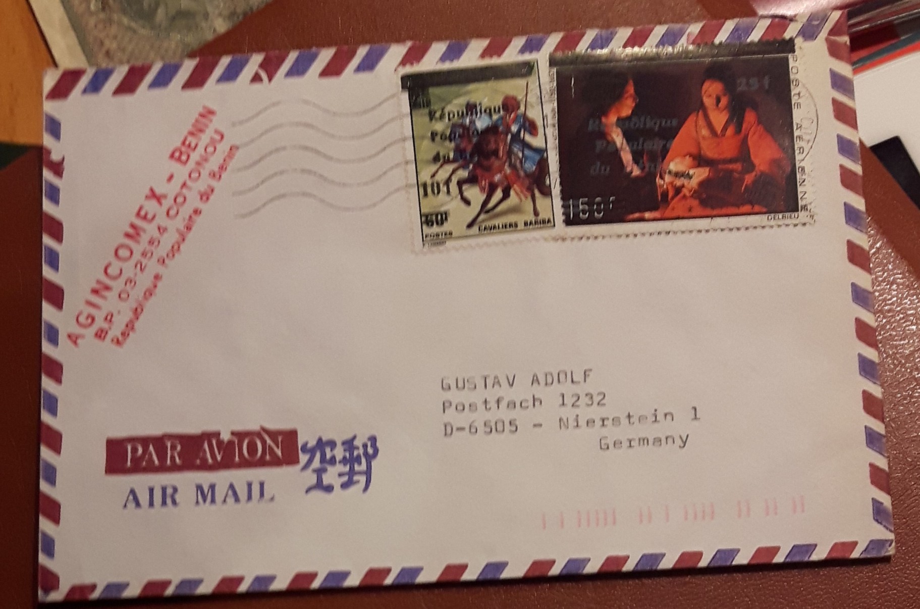 1. Brief aus Benin nach D, vermutlich 1980er Jahre. Die linke Marke ist A473 (jedenfalls damals), ohne Preis im Michel gelistet. Die rechte Marke habe ich nicht gefunden. Gibt es heute Katalogpreise dazu?