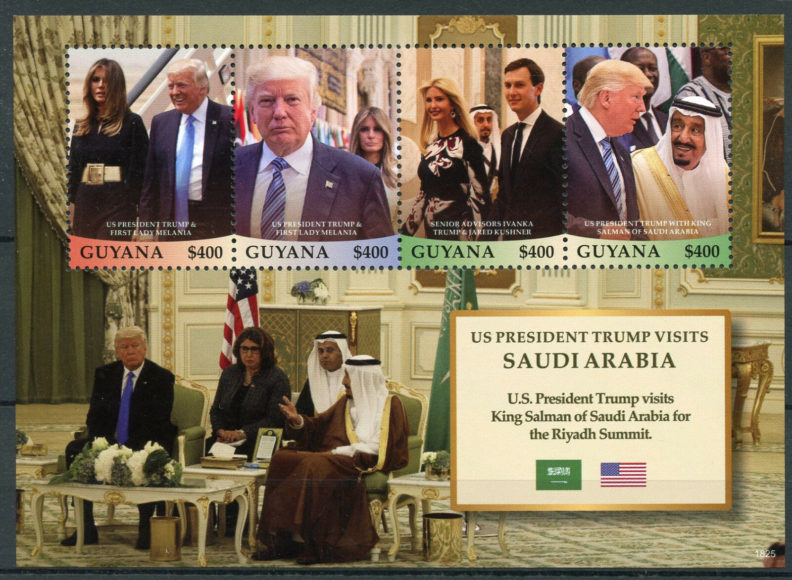 Zum Staatsbesuch von Trump in Saudi-Arabien erschien im Juli 2018 ein Kleinbogen mit 4 Werten in Guayana (Michel-Nr. 9471-9474). Der Kleinbogen wird von Michel nicht als Block katalogisiert. Außer Trump ist auch noch seine Frau Melania und seine Tochter Ivanka mit Schwiegersohn Jared Kushner zu sehen: