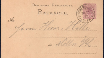 Heute zeige ich euch eine Postkarte im Fernverkehr vom 25. Januar 1881 aus Grevesmühlen nach Mölln. Das Porto dafür betrug 0,05 Mark und wurde durch Verwendung von einer Ganzsache zu 0,05 Mark (1 x Mi.-Nr. P 10 - Ausgabe von 1880) entrichtet. Dieses Postwertzeichen wurde mit dem Kreisstempel GREVESMÜHLEN entwertet.