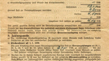 Inhalt der Drucksache des Leiters des Kirchensteueramtes ist der Kirchensteuerbescheid 1949, freigemacht wurde mit Mi.-Nr. 213 der Sowjetischen Zone - Allgemeine Ausgaben.