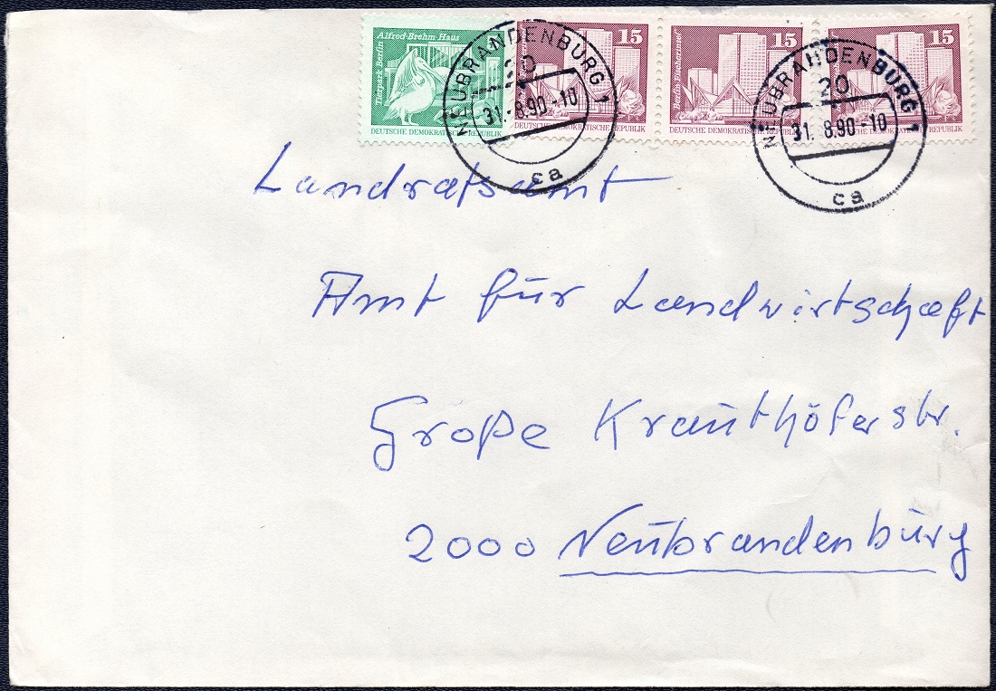 Es folgt ein Brief bis 20 g vom 31. August 1990 aus der Stadt Neubrandenburg nach Neubrandenburg.