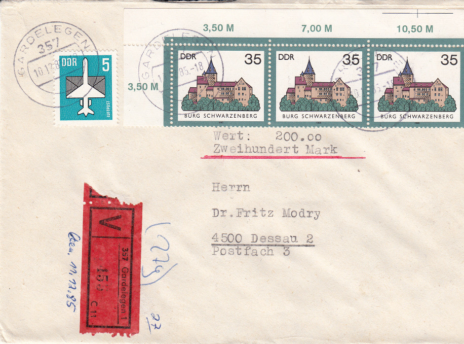 Der Brief ist portogerecht. Ein Fernbrief Inland über 20g (das Gewicht von 27g ist ja auf dem Umschlag notiert) kostete 1985 40 Pfennig, hinzu kamen 20 Pfennig für die Wertsendung bis 500 Mark und weitere 50 Pfennig als Behandlungsgebühr für Wertbriefe. Macht zusammen 110 Pfennig.