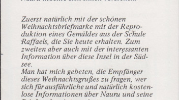 Ab 1916 wurde die Insel dann durch Australien und Neuseeland besetzt. Die ersten eigenen Marken aus der Zeit waren aus Großbritannien und wurden mit Nauru überdruckt. Und aus Nauru wurde für eine kurze Zeit "Pleasant Island". Hier ein Brief aus dieser Zeit (1917).