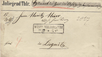 Postalisch trat Wüstewaltersdorf im Jahr 1826 durch die Eröffnung einer Postexpedition ins Rampenlicht. Es sind (gemäß Feuser/Münzberg: Deutsche Vorphilatelie) zwei vorphilatelistische Stempel bekannt. Ein L3-Stempel (ab 1826) und ein K1-Stempel (ab 1835). Beide habe ich noch nie gesehen, folgerichtig fehlen beide Stempel in meiner Sammlung.