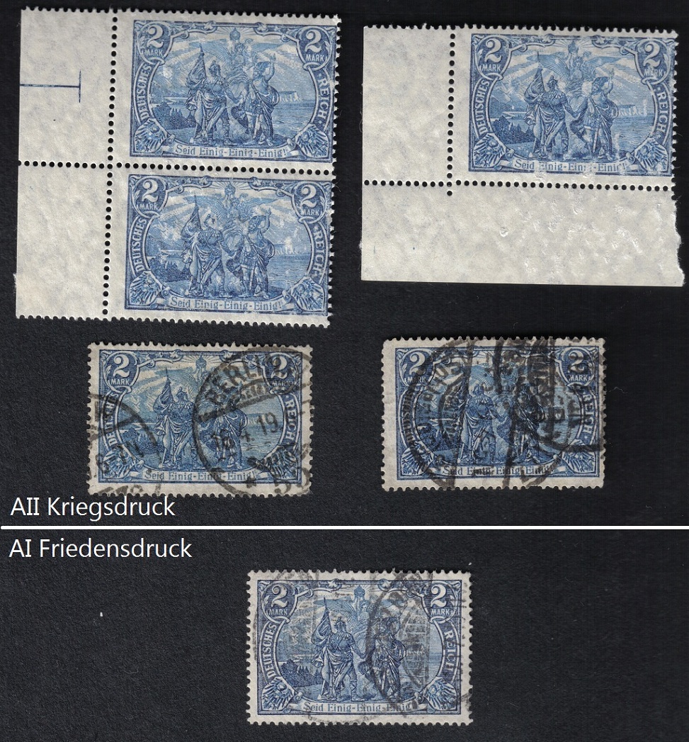 Mehrere Merkmale der jeweiligen Marken sprechen für mich sowohl für Kriegs- ( Stempeldaten, undeutliche WZ ) als auch für Friedensdrucke ( Markenbild, Papier ).