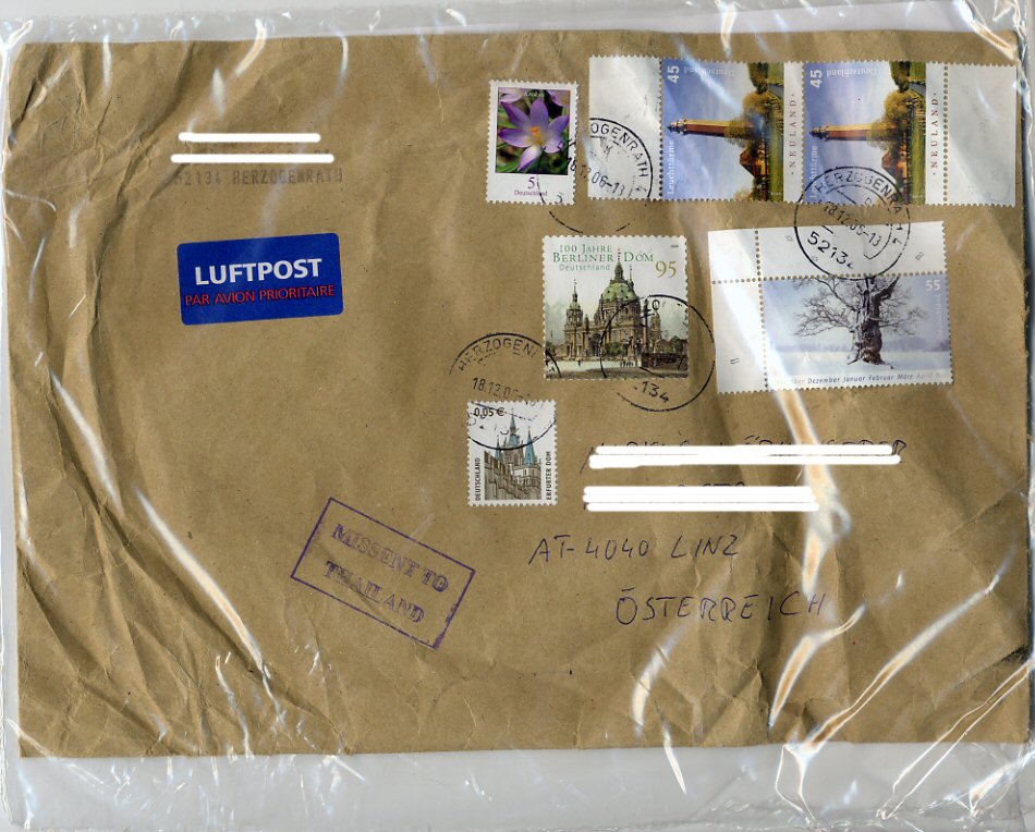 Interessant finde ich, daß ein Stempel "Missent to Thailand" überhaupt existiert. Wie viele Sendungen wurden wohl täglich dahin geschickt, bis sich jemand gedacht hat, daß sich die Anschaffung eines solchen Stempels lohnt...