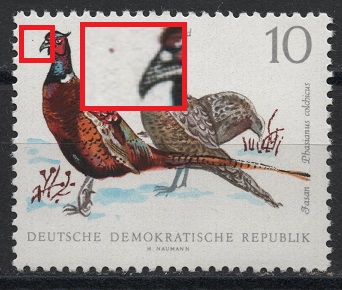 1357 brauner Fleck links neben dem Schnabel des linken Fasanen