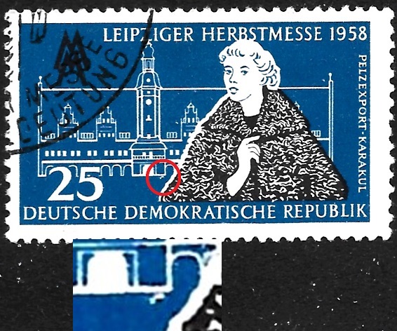 DDR 976 mit Farbspritzer (rot) links neben dem Messezeichen: