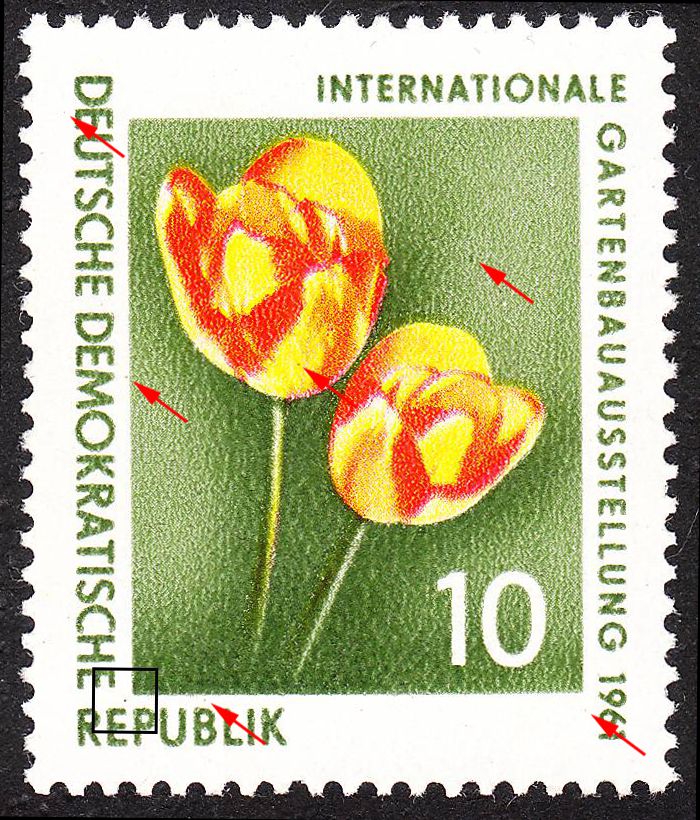 der rote blütenpkt. ist auf beiden bogen II nur erahnbar, evtl. unterschiedl. ausprägung oder druckzufälligkeit oder dann nur auf nicht vorliegendem bogen III vorkommend.