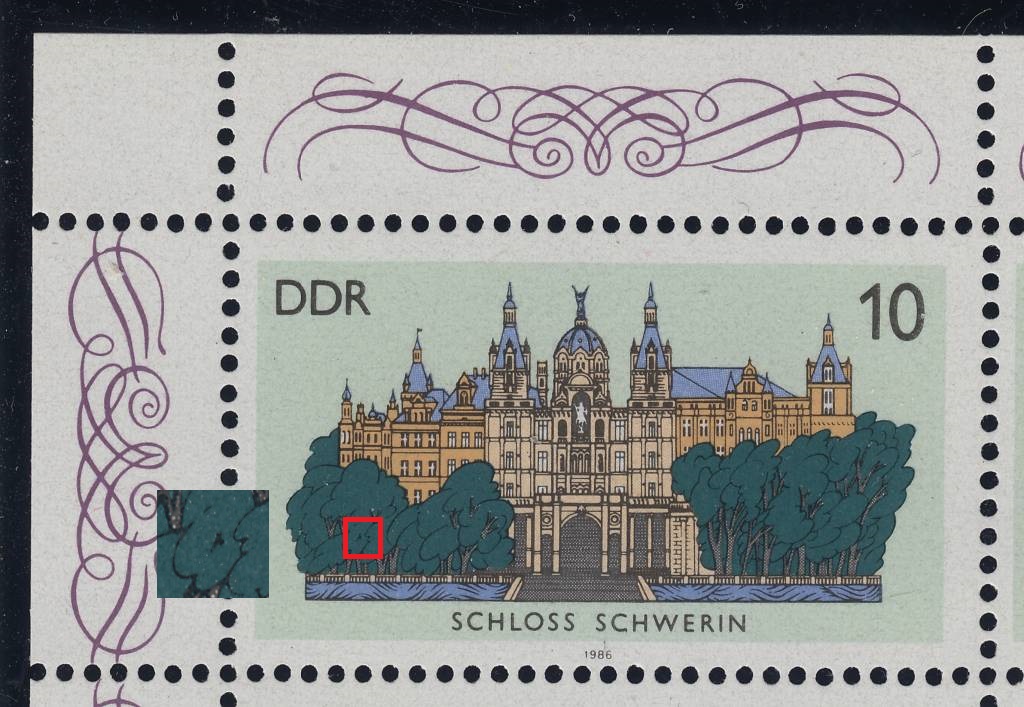 weißer Fleck unten am vierten senkrechten Strich der oberen Etage (sieht aus wie ein "J"). Mir liegt dieser Fehler sowohl postfrisch als auch mit BST vor (Felder sind bekannt).