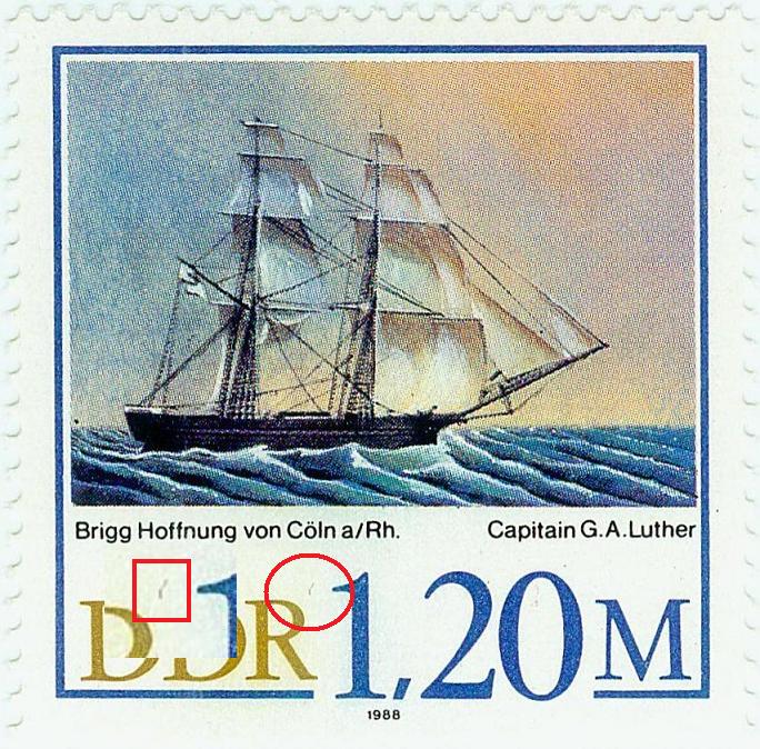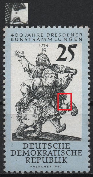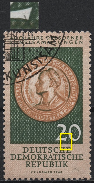 ich mache es bei solchen Sachen immer so, dass ich mit einer Taschenlampe von hinten die Marke beleuchte und gleichzeitig mit einer Lupe mir die Vorderseite anschaue. Wenn die Stelle heller durchscheint als z.B. am Rand der Marke, ist es Beschädigung des Aufdruckes inkl. dem Papier. Wenn es nicht heller durchscheint als am Markenrand, dann könnte es etwas sein. Die Wahrscheinlichkeit, dass es sich aber um eine Verschmutzung am Druckträger handelt ist sehr groß.