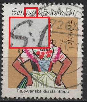 Der Strich stimmt mit der allgemeinen Linienführung im Markenbild nicht überein. Damit schließe ich eine Retusche aus. Der Strich kann durch eine mechanische Verletzung (Kratzer) entstanden sein.