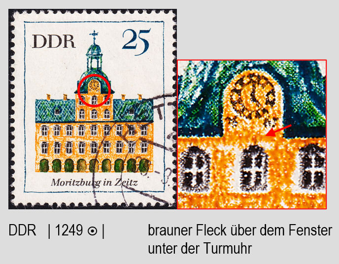 DDR 1249 | gest | brauner Fleck über dem Fenster unter der Turmuhr