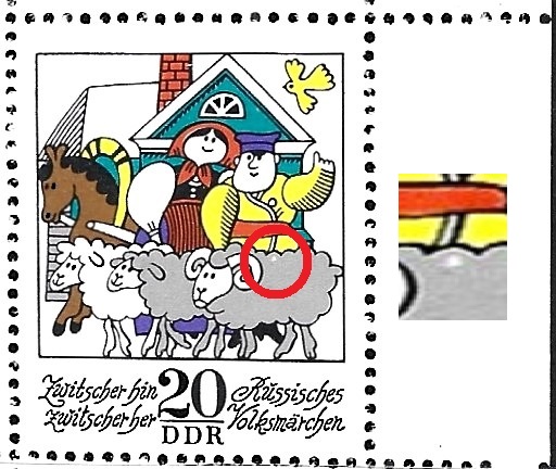 DDR 976 mit Farbspritzer (rot) links neben dem Messezeichen: