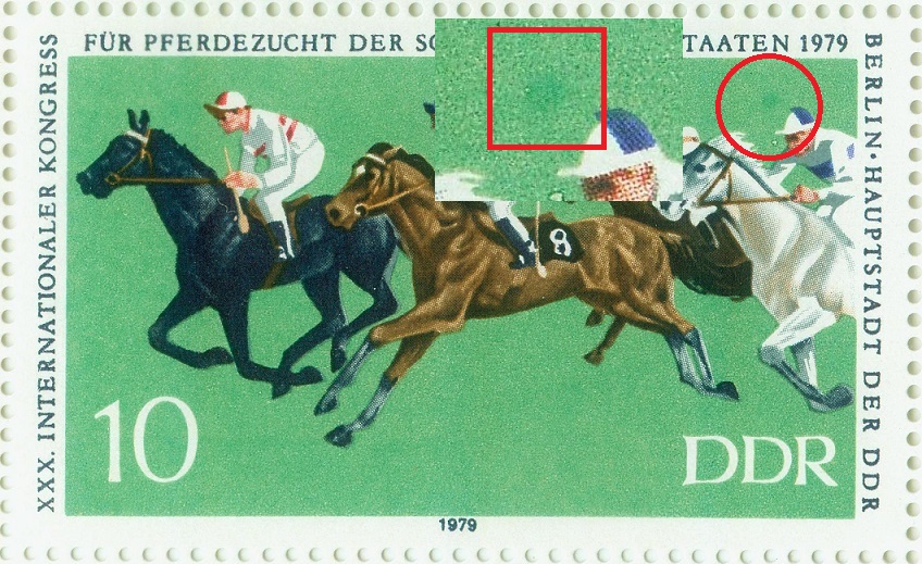 ist Zufall (Stempelfarbe hat hier weniger gut gehaftet) siehe rechts unten am Stempel beim Grün da ist es ähnlich. Der Stempelabdruck erfolgte ganz sicher nach dem Briefmarkendruck.