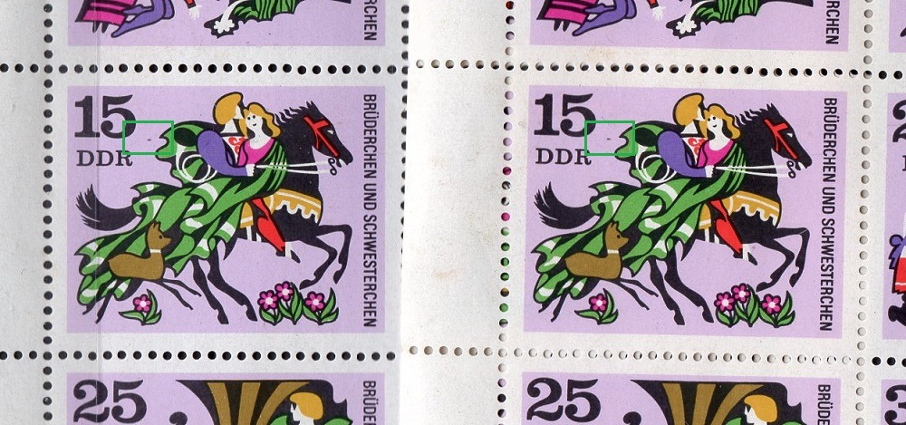 1435 sehe ich den Fleck als nicht markenfarben an. Du könntest aber mal beim DV nach der linken Marke (nicht im Bild) noch mal schauen, da es z. B. bei Bogen mit DV-Nr. II Nachgravierungen gibt.