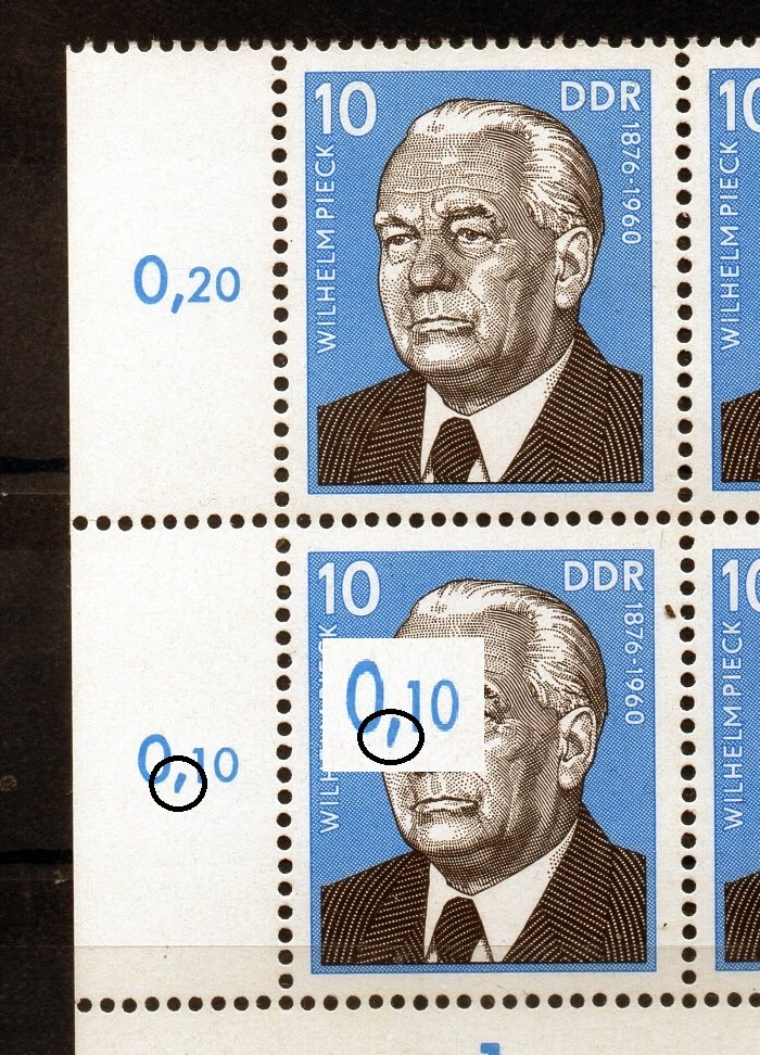 Das verkürzte Komma über Feld 1 kommt auf allen 4 Bogenformen vor.