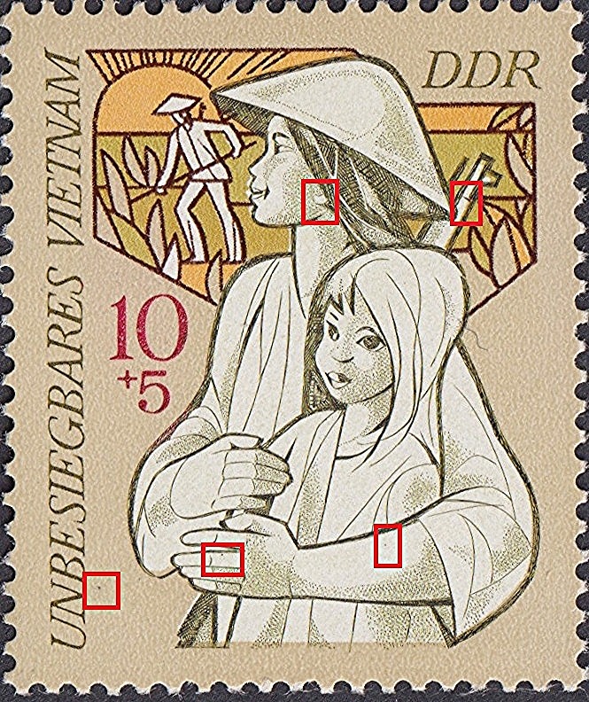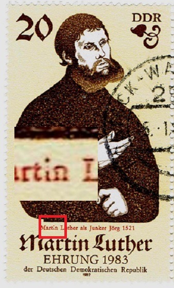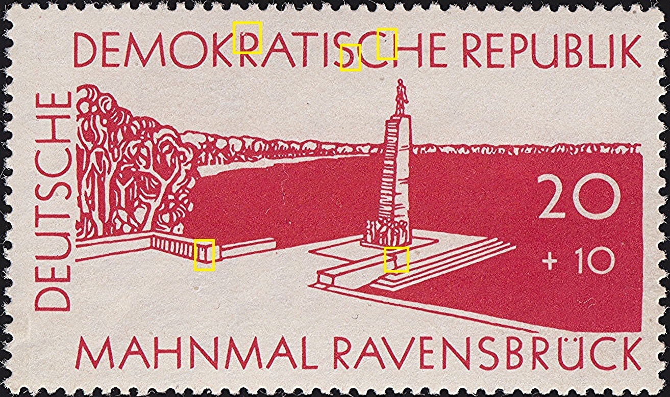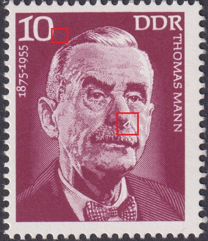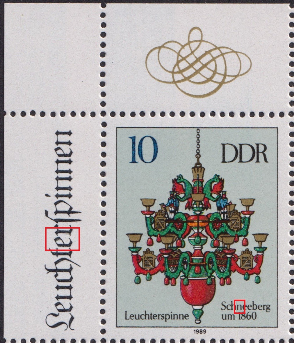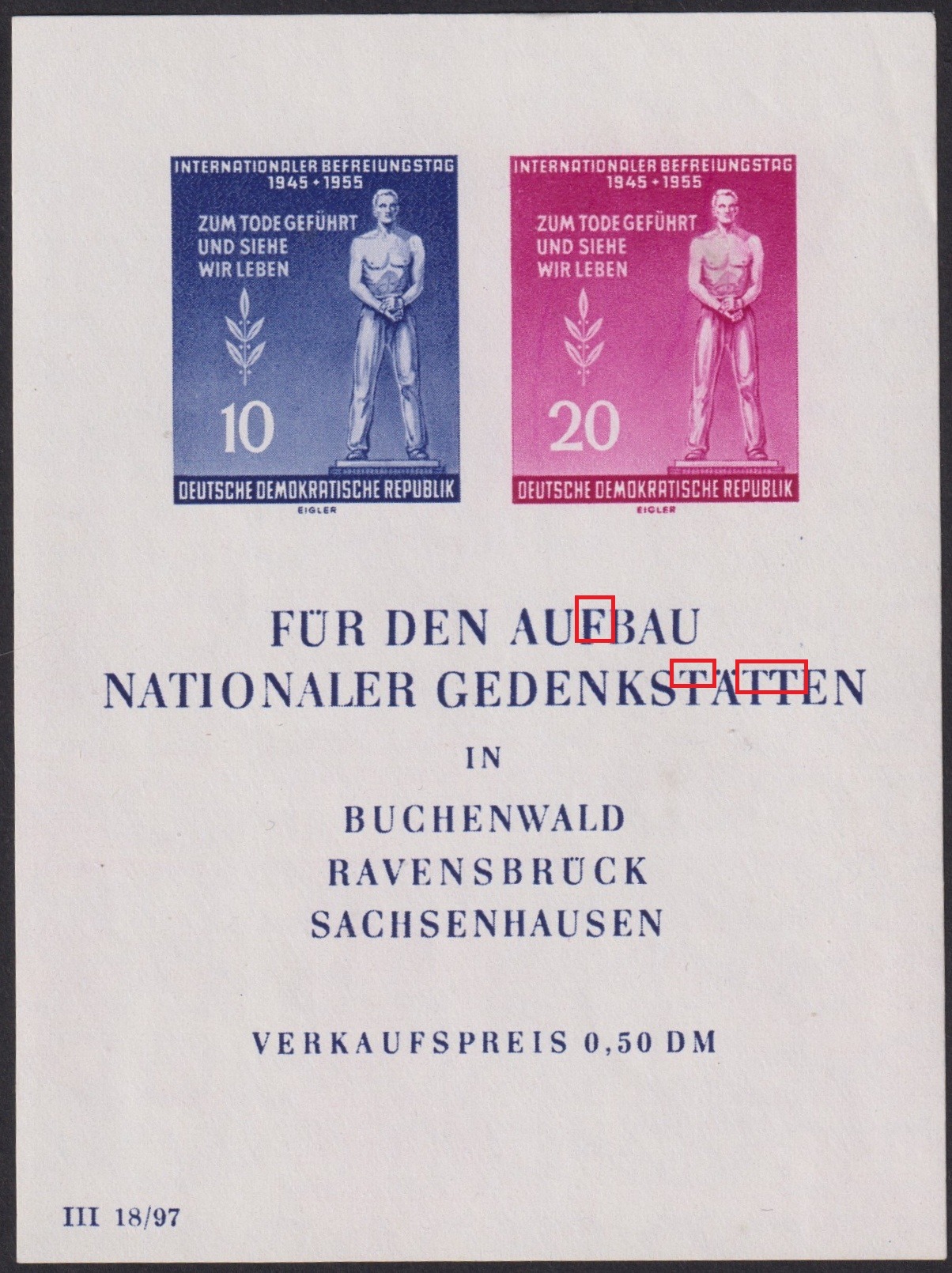 Bei Bl 11, dieses oben flache 2. ''T;, von Gedenkstätten nehme ich auf, um die Sammler darauf hinzuweisen, dass der Fehler auf jedem Block vorkommt. Und wer weiß, vielleicht taucht irgendwann ein Stück auf mit nachgravierten Serifen vom ''T''.