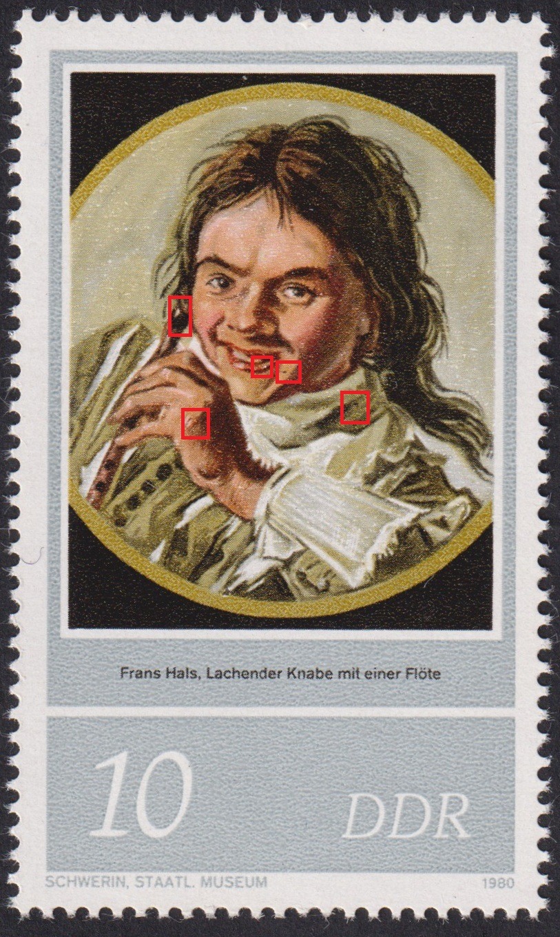 Hallo Thomas, die gleiche Nr. mit anderen Fehlern , schwarzer Fleck auf der Backe und Kragen, weißer Punkt auf der Lippe, Fleck im Haar, Strich auf dem Handrücken.