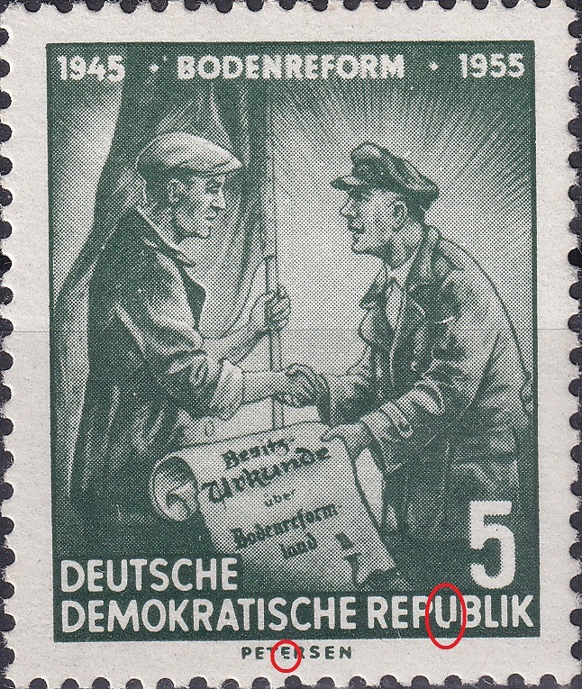 Hallo meine Vorstellung stellt keine Druckabweichung vom Markenbild dar. Da mir der Fehler zwei Mal vorliegt, stelle ich diesen trotzdem einmal vor. Es dürfte sich um eine Besonderheit für Stempelliebhaber handeln. Warum diese kreisförmige Unterbrechung im Querstrich des Stempels entstanden ist kann ich nicht beurteilen. Hierfür ist die Meinung von Spezialisten gefragt.