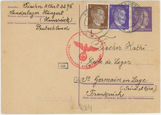 Auf einer Webseite findet man einen Lagerbrief mit Stempel Hermeskeil vom Sonderlager Hinzert (nicht Hinert). Die Inschrift auf dem roten Lagerstempel ist schwer zu entziffern (Oberkommando der Wehrmacht?). Und das Wort oben könnte heissen: Geprüft, also ein Zensurstempel vom Lager.