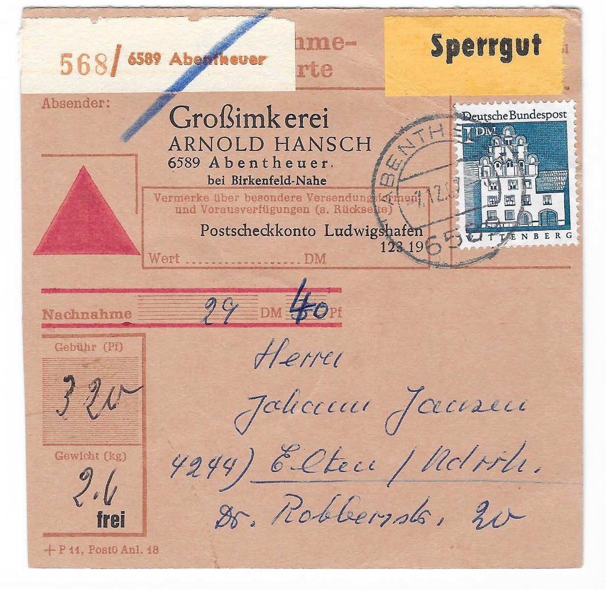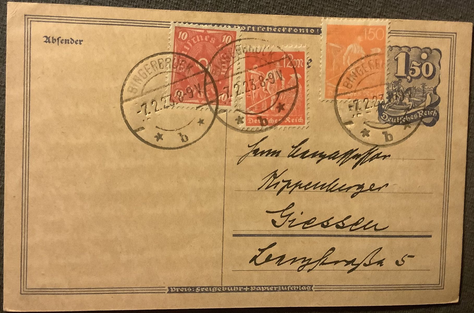 1969 wurde Bingerbrück eingemeindet (Stadtteil nördlich der Nahe, strenggenommen passt dieser in meine Sammlung, andere Stadtteile nicht weil südlich der Nahe). Hier ein schöner Inflabeleg, mit 25RM richtig frankiert (Fernpostkarte vom 7.2.23).