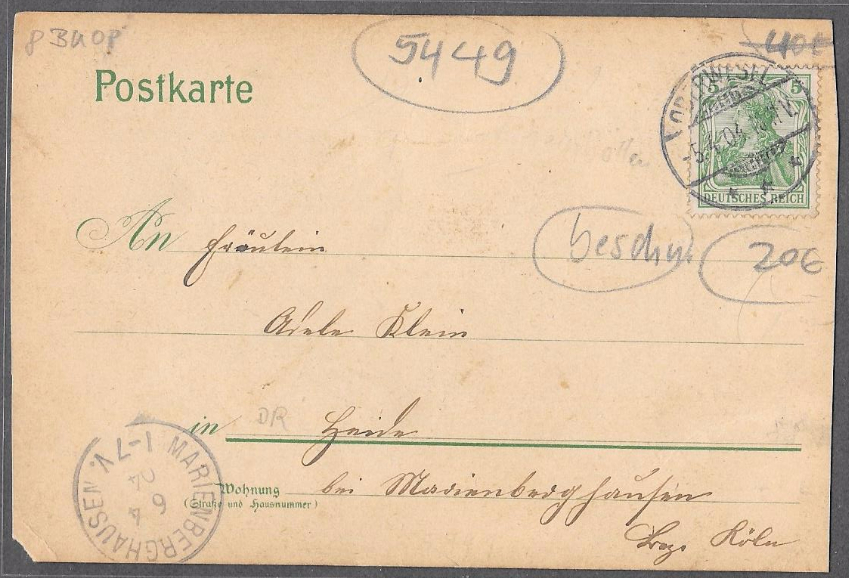 4) Wenn sich auf diesem keine Stockflecken gebildet hätten wäre diese Karte das wohl schönste Stück meiner Ansammlung :frust:. Den Stempel Völkenroth habe ich auf keiner Stempeldatenbank finden können.