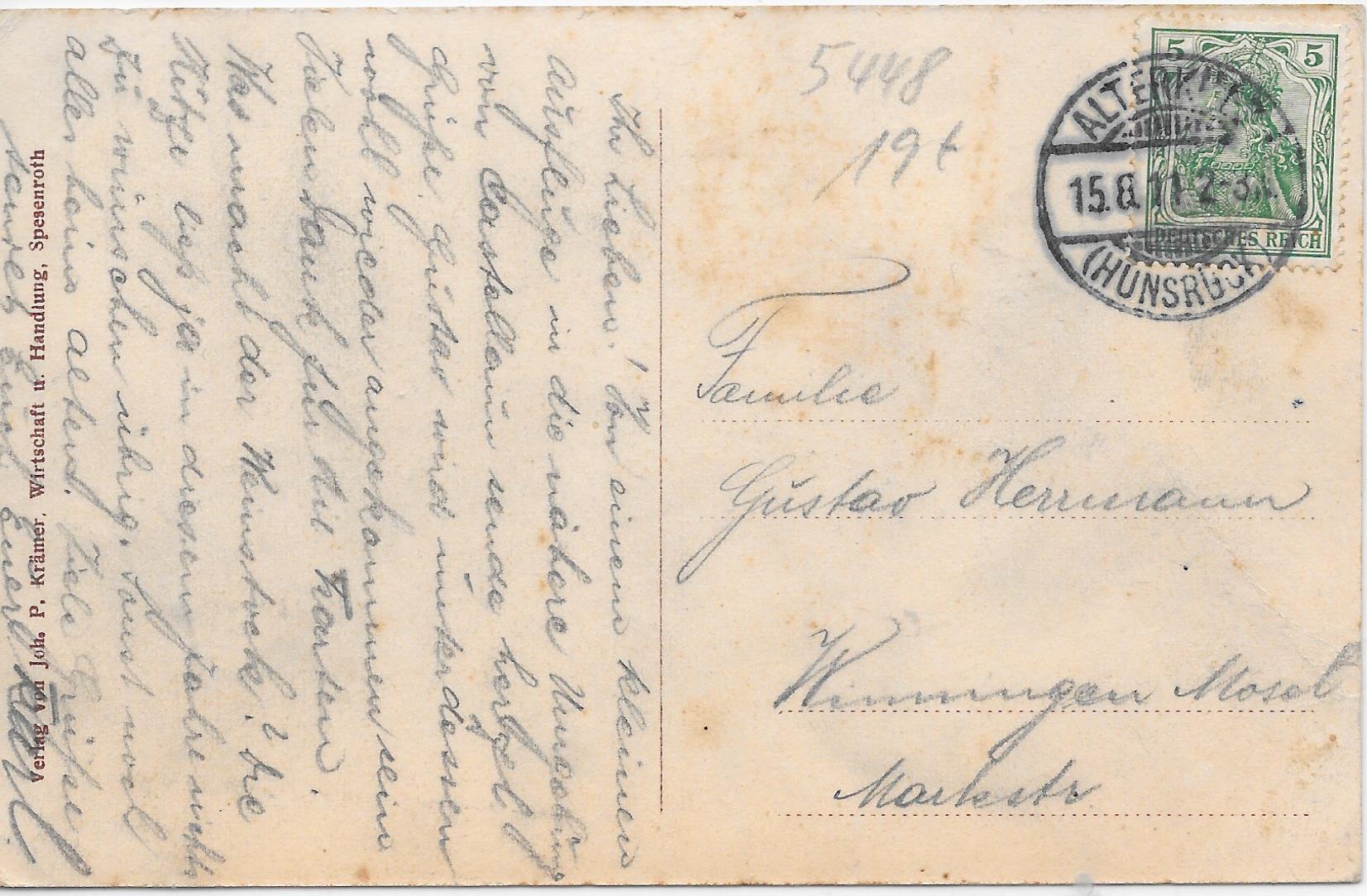 gestern war ich mal wieder auf einem Flohmarkt, diesmal in Linz/Rhein. Es waren 3 Händler für Ansichtskarten anwesend. Leider hatte keiner den alten PLZ-Bereich 65... dabei, weshalb sich mein Interesse sehr einschränkte auf 2 Bereiche, einmal der Umkreis Kastellaun (5548) und Sankt Goar (5401). Viel wurde zu extrem hohen Preisen verkauft, einige Ansichtskarten für +/- 40€, so viel gebe ich nicht aus. Trotzdem ging für mich der Tag ordentlich in den Geldbeutel, bin aber zufrieden und habe schöne Funde gemacht. Hier mal die, meiner Meinung, schönsten Belege.