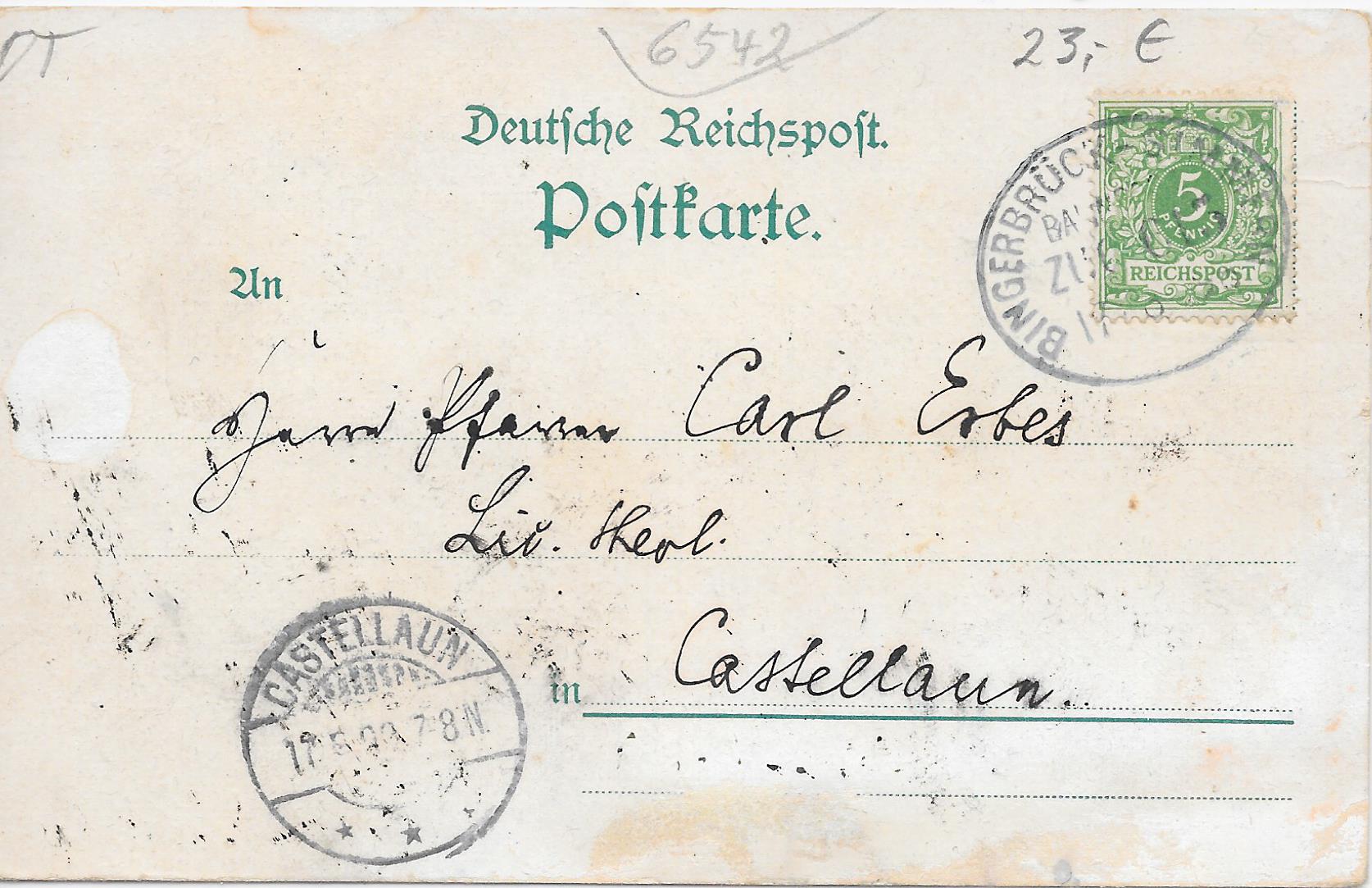 Auch die Rückseite hat es mir sehr angetan. Der Bahnpoststempel Bingerbrück-Simmern ist nicht schlecht abgeschlagen. Dazu ist auch die Geschichte sehr interessant, weil die Karte nach Castellaun/Kastellaun ging (liegt ebenso im Hunsrück). Die Strecke Langenlonsheim-Simmern (Bingerbrück liegt auf der Strecke) wurde 1889 eröffnet. Eine weitere Strecke von Simmern nach Kastellaun wurde erst 1901 eröffnet. Die Ansicht wurde jedoch 1899 verschickt. Daher konnte die gesamte Strecke noch nicht der der Bahn überwunden worden, so ging die AK von Simmern weiter nach Kastellaun.