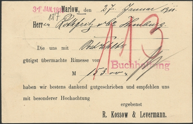 Abgeschlagen wurde die Marke mit einem K1 Kreisstempel, wobei die Zeitangabe "11-12V." im Gegensatz zur Ortsangabe "Marlow" mit Serifen versehen ist.