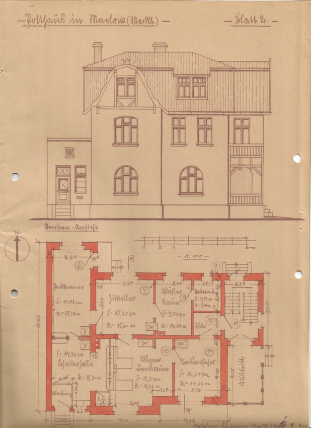 heute soll es um die Marlower Post gehen. Genauer gesagt das alte Postgebäude, welches im Jahr 1926 bezogen wurde. Das Haus wurde im Januar 1926 für 17693,- Reichsmark von einem Walter Kunstmann gekauft, und beherbergte neben der Post auch die Wohnung des Postmeisters Klähn. Die Diensträume nahmen 89,49m² ein, die Dienstwohnung 109,59².